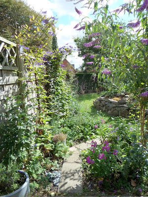 Det nye bed ved portalen er blevet meget frodigt på kort tid, længe leve sommerblomster. De allium lignende blomster, er løg der er gået i stok. Jeg har flyttet dem fra køkkenhaven til bedet, det ser ud til de er ok med flytningen.